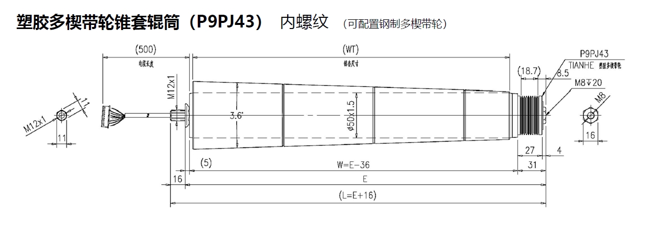 電動輥筒 塑膠多楔帶輪錐套輥筒(P9PJ43) 內螺紋 (可配置鋼制多楔帶輪)